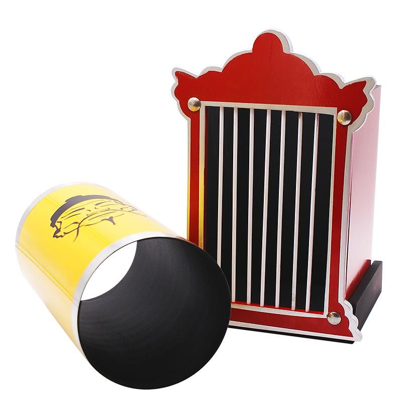 El mago muestra al público un paralelepípedo y un tubo, ambos vacíos. ¡Inmediatamente después hace aparecer pañuelos, tiras de seda y más!
