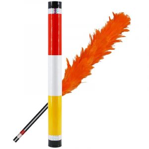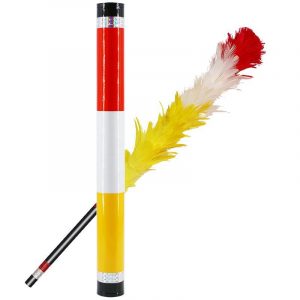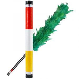 Muestras un solo plumero verde y un tubo vacío. El plumero se empuja dentro del tubo y cuando se saca, se ve que ha cambiado a naranja. Se vuelve a empujar dentro del tubo y, cuando se vuelve a sacar, se ve que ha cambiado a tres colores diferentes (rojo, blanco y amarillo). Se empuja hacia adentro por última vez y cuando se saca, se ve que el plumero ha vuelto a ponerse verde.