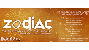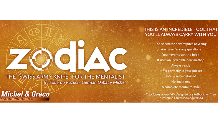 Con este librito de aspecto inocente, que cabe perfectamente en tu bolsillo, podrás realizar un completo acto mental. Adivinarás al instante el signo, día y mes de nacimiento de cualquier espectador. También podrás adivinar el aura del espectador, su rasgo de personalidad y la carta de la suerte del espectador. Lo sabrás todo de inmediato, sin tocar ni acercarte al libro y sin pesquisas ni preguntas. EL ESPECTADOR NUNCA ESCRIBE NADA. También podrás adivinar una palabra libremente elegida del libro. Este libro te permite hacer una rutina completa con adivinaciones, predicciones, coincidencias, ACAAN (Any Card At Any Number), calendario, etc.